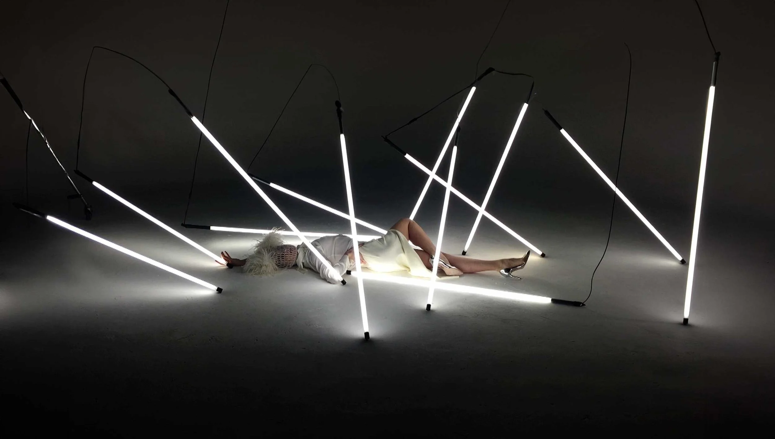 Time constructed as light. Mechanics unfold as spatial form — refracted, multiplied, suspended.
